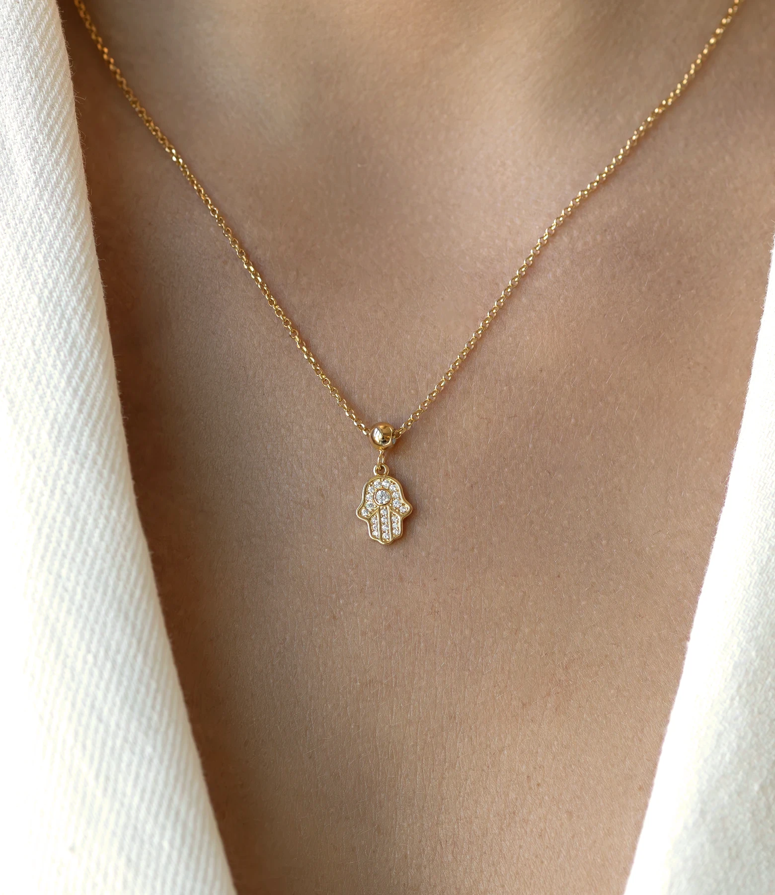 Der Fatima Hand Charm ist ein bedeutungsvolles Schmuckstück, das Schutz, Glück und spirituelle Kraft symbolisiert. Das ikonische Hand-Symbol ist mit funkelnden Zirkoniasteinen verziert, die dem Charm einen eleganten Glanz verleihen und ihn zu einem besonderen Blickfang machen.